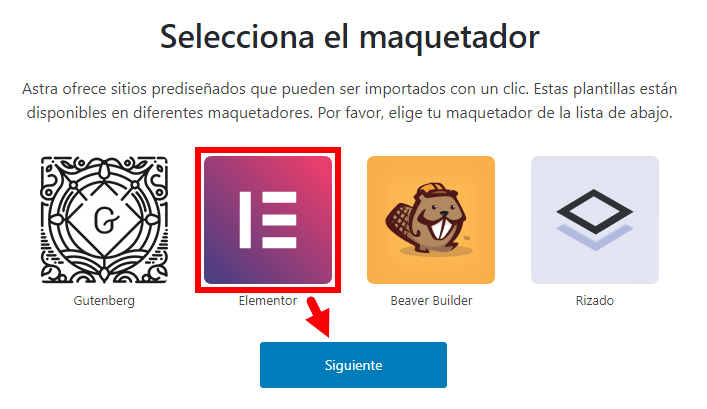 Una vez escojas Elementor como tu maquetador, verás las diferentes plantillas de Astra: