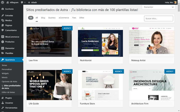 Como verás hay más de 100 plantillas disponibles para todo tipo de negocios, las plantillas con una etiqueta de AGENCY solo están disponibles en la versión de agencia de Astra, con la versión gratuita tienes más de 50 plantillas disponibles.
