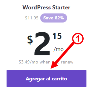 - Selecciona el plan que quieres contratar (WordPress Starter, Premium o Business) y cliquea en el botón de “Agregar al carrito”, ten en cuenta que los precios pueden estar en tu moneda local.