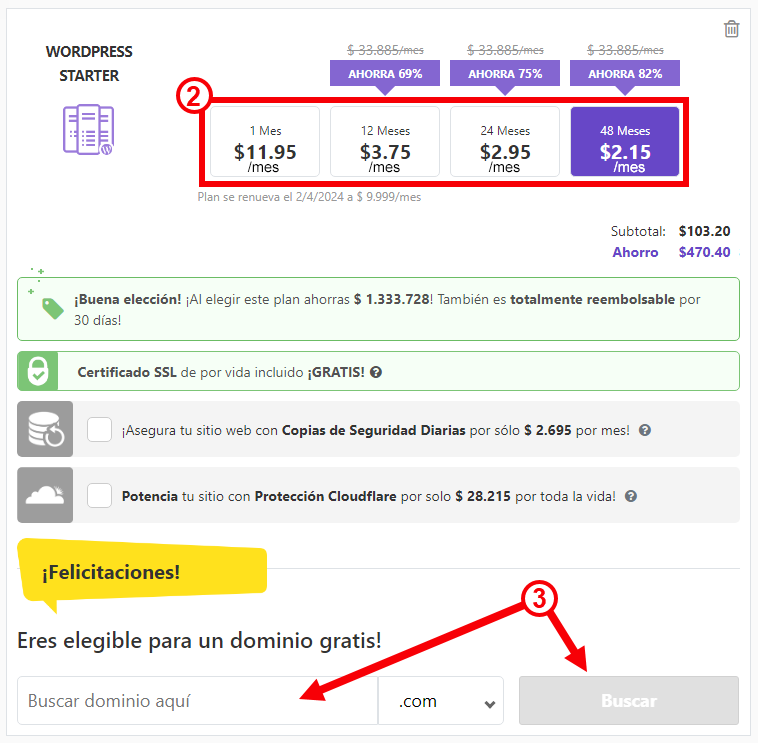- Escoge la duración de tu plan, cuando contratas el hosting por 48 meses recibes el mayor descuento en el servicio: