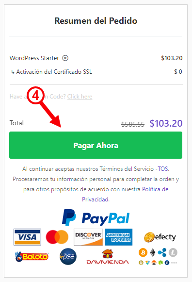 Hostinger te permite pagar de múltiples maneras, los medios de pago que verás debajo del botón corresponderán a los de tu país.