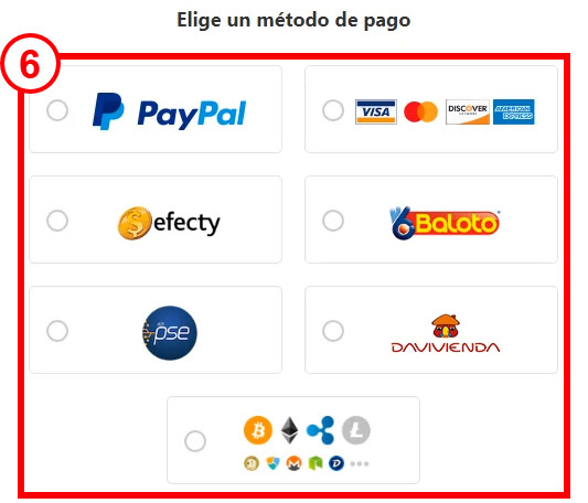 - Elige un método de pago, los de la imagen debajo corresponden a Colombia, los tuyos cambiarán dependiendo de tu locación: