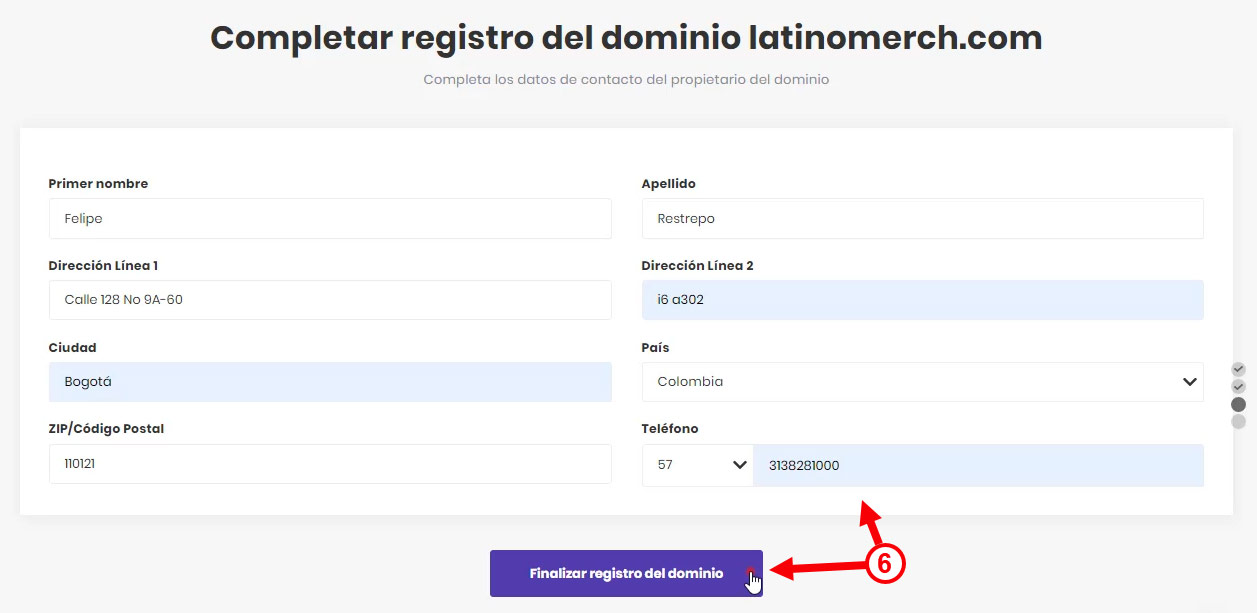- Ingresa tus datos para continuar con el registro de tu dominio