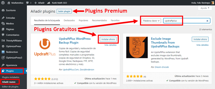 Para plugins premium, haz clic en Subir plugin y selecciona el archivo .zip